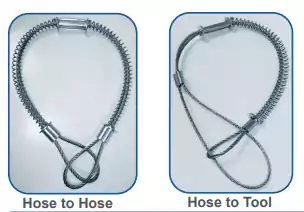 • Los cables de seguridad de acero galvanizado con resortes hacen un nudo sobre cada manguera para evitar que las mangueras se desconecten en caso de separación accidental de los acoples