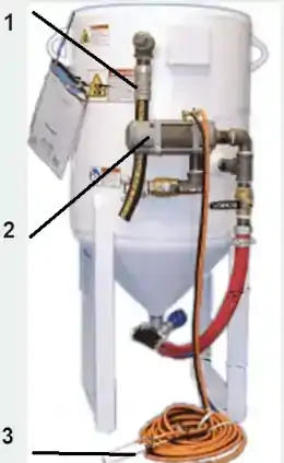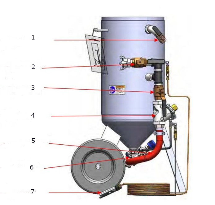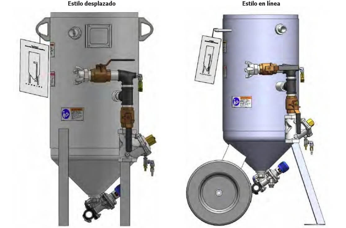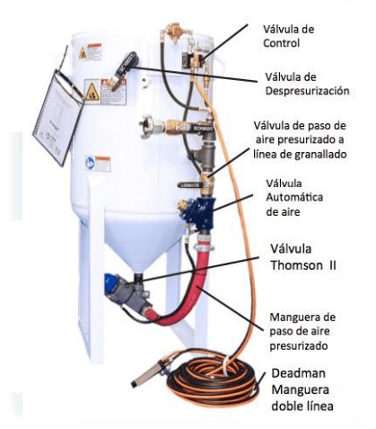 La tolva se despresuriza cuando se suelta la palanca del control deadman permitiendo el paso de abrasivo para llenado de la tolva, incluye: