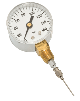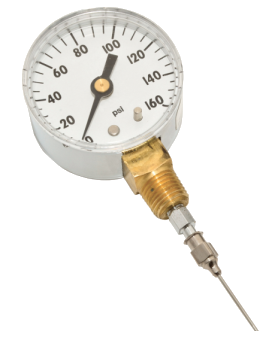 O manômetro de agulha é projetado para medir a pressão do ar na mangueira de jato de granalha e na mangueira de ar. O uso adequado deste medidor permite identificar quedas de pressão que causam redução nas taxas de produção, consumo de abrasivo e falhas nos sistemas de limpeza de abrasivo e na criação do perfil de ancoragem.