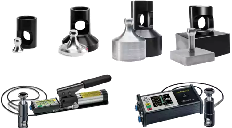 Os ladrilhos de 10 mm, 14 mm, 20 mm, 50 mm, 50 x 50 mm e os dollies C1583 de 50 mm maximizam a capacidade e a resolução da medição em uma ampla faixa de resistências de adesão