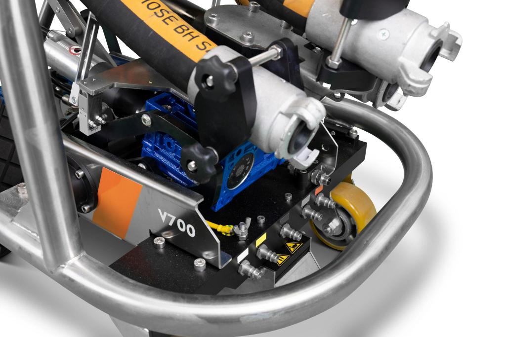 La serie V700 funciona de forma remota, lo que mantiene a los operadores a salvo de equipos peligrosos de granallado abrasivo y de alta presión, lo que reduce posibles lesiones. También reduce la inhalación de polvo, una distancia segura de los residuos de granallado y las conexiones de cables de control, y proporciona las procesos de granallado más cómodos. Todo ello contribuyendo a un ambiente de trabajo más saludable.