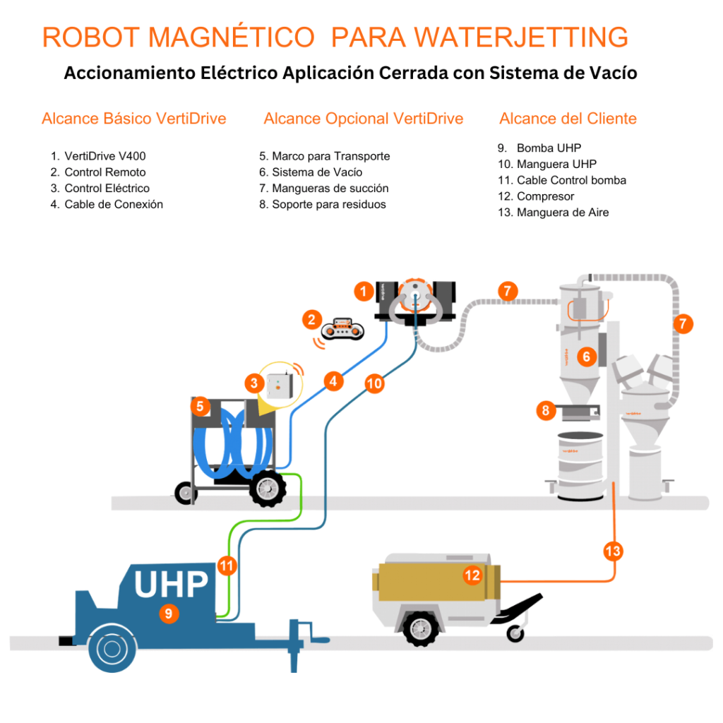 Experimente una nueva era de preparación de superficies industriales con la Serie V400. Esta innovadora solución robótica está diseñada para soportar duras condiciones industriales, cumplir con las cambiantes regulaciones ambientales, de seguridad y laborales, y es capaz de funcionar en diversas posiciones (boca abajo, vertical u horizontal) gracias a su robusto sistema magnético.