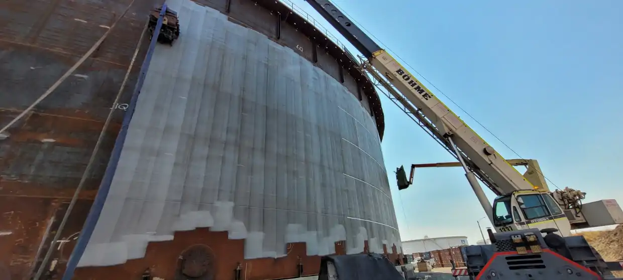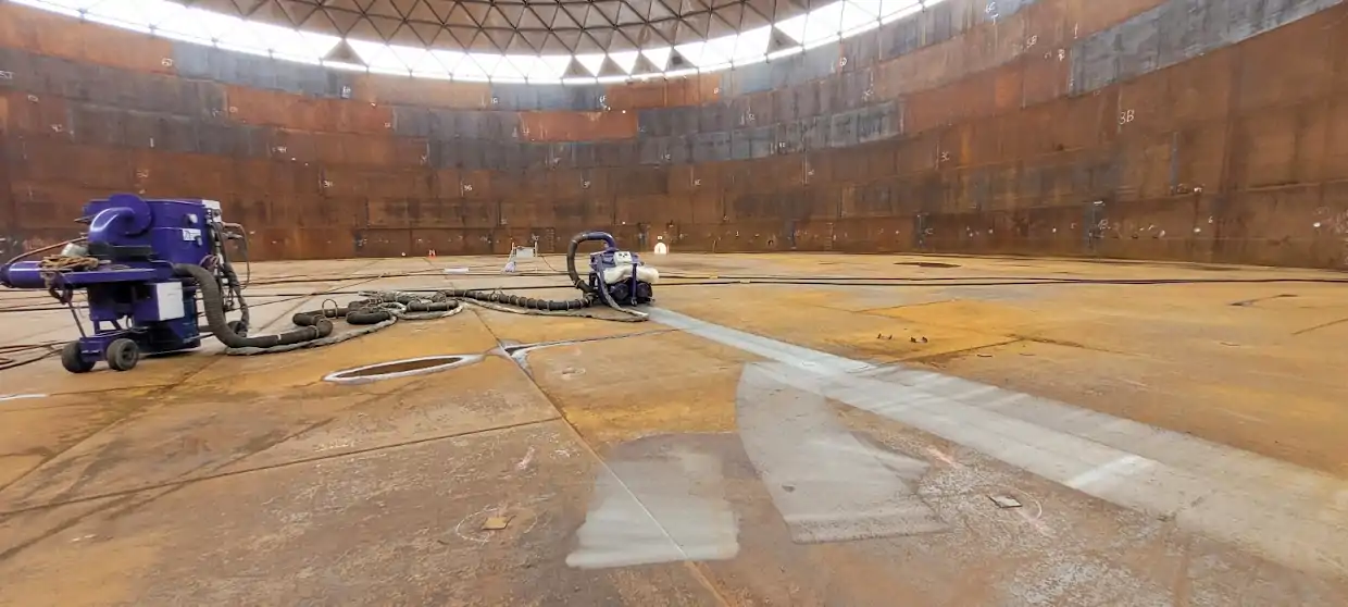 A limpeza e preparação das superfícies horizontais e verticais dos dois tanques de armazenamento de 500 mil barris foi realizada com o Robot Faster Blaster FB32, utilizando abrasivo de qualidade Ervin Industries S330.